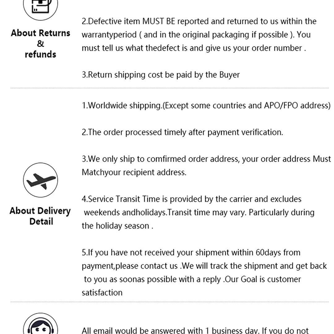 Sollten Sie ein beschädigtes oder falsches Produkt erhalten, kontaktieren Sie uns bitte umgehend und legen Sie uns ein Foto als Beweis vor. Wir senden Ihnen dann Ersatz oder erstatten Ihnen den vollen Kaufpreis.